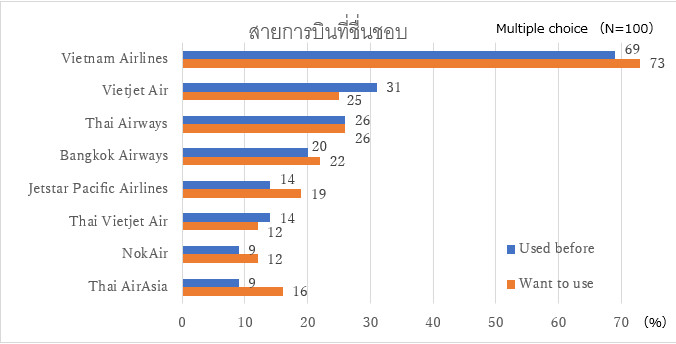 สายการบิน Vietnam Airlines มีความโดดเด่นมาก ส่วน VietJet Air สายการบินต้นทุนต่ำของเวียดนามก็เป็นที่ชื่นชอบเช่นกัน แสดงให้เห็นว่านักท่องเที่ยวชาวเวียดนามต้องการใช้สายการบินในประเทศของตนเอง สายการบิน Vietnam Airlines ได้รับการประเมินสูงสุดจากผู้ที่เคยใช้บริการ โดย 82.6% ของผู้ที่เคยใช้บริการตอบว่าต้องการใช้บริการสายการบิน Vietnam Airlines อีกในอนาคต และผู้ตอบแบบสอบถามที่อายุมากกว่า 25 ปีชอบการบินไทยเกือบเทียบเท่า VietJet Air