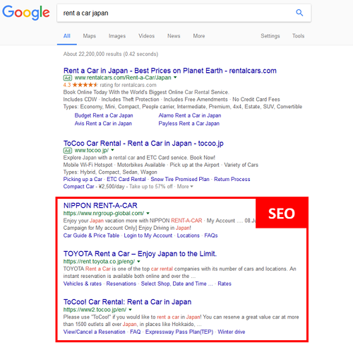 Example of search result by the keyword "rent a car japan"