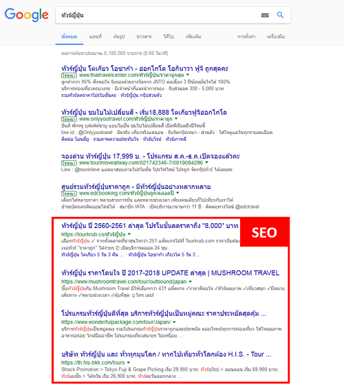 ตัวอย่างหน้าผลการค้นหาของ Google.co.th โดย Keyword คำว่า "ทัวร์ญี่ปุ่น"